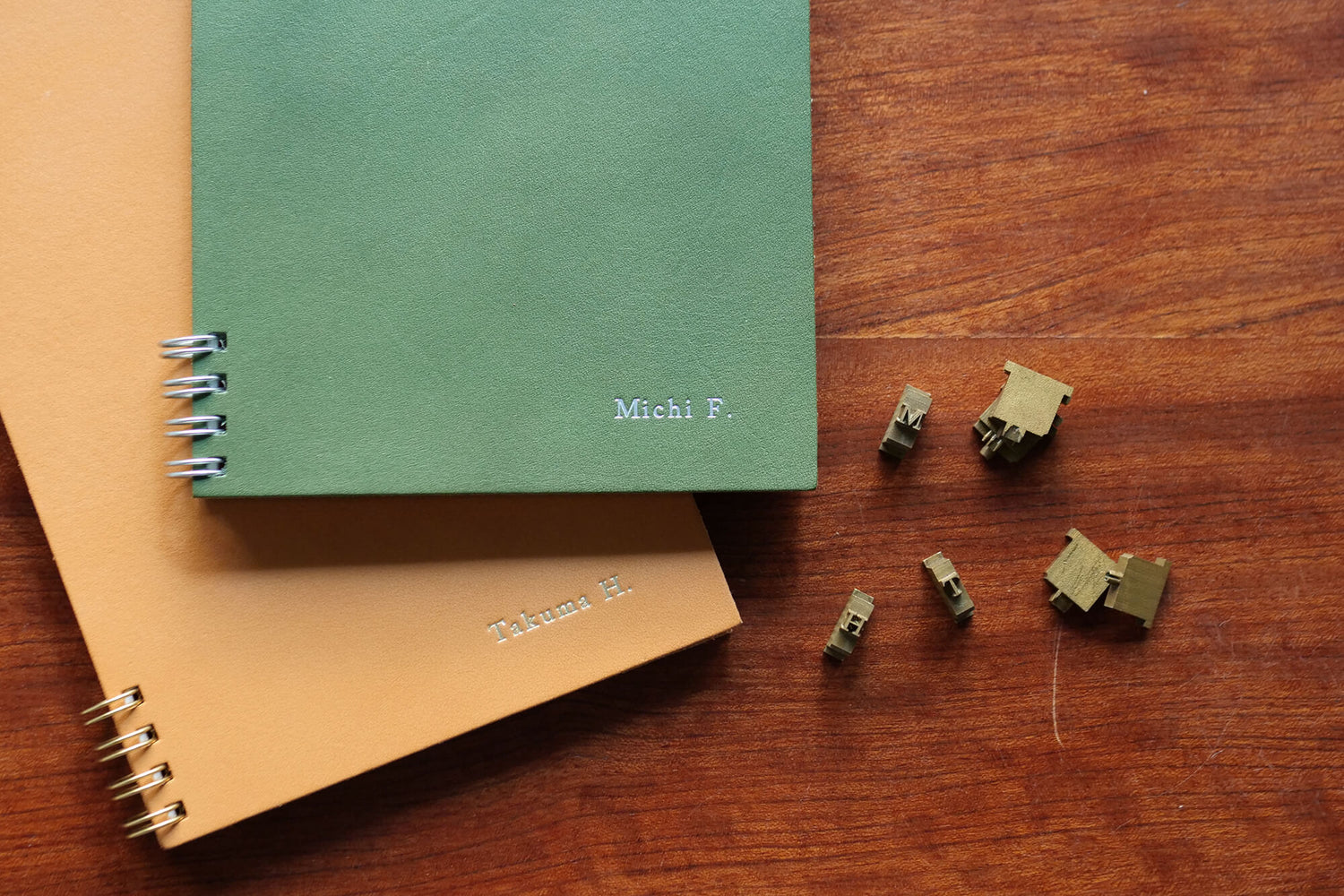 カキモリのリングノートに箔押しで名前等の好きな文字を入れられます。