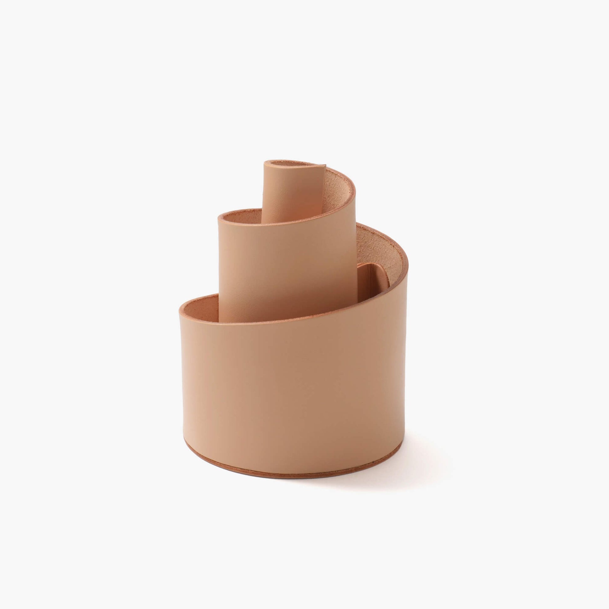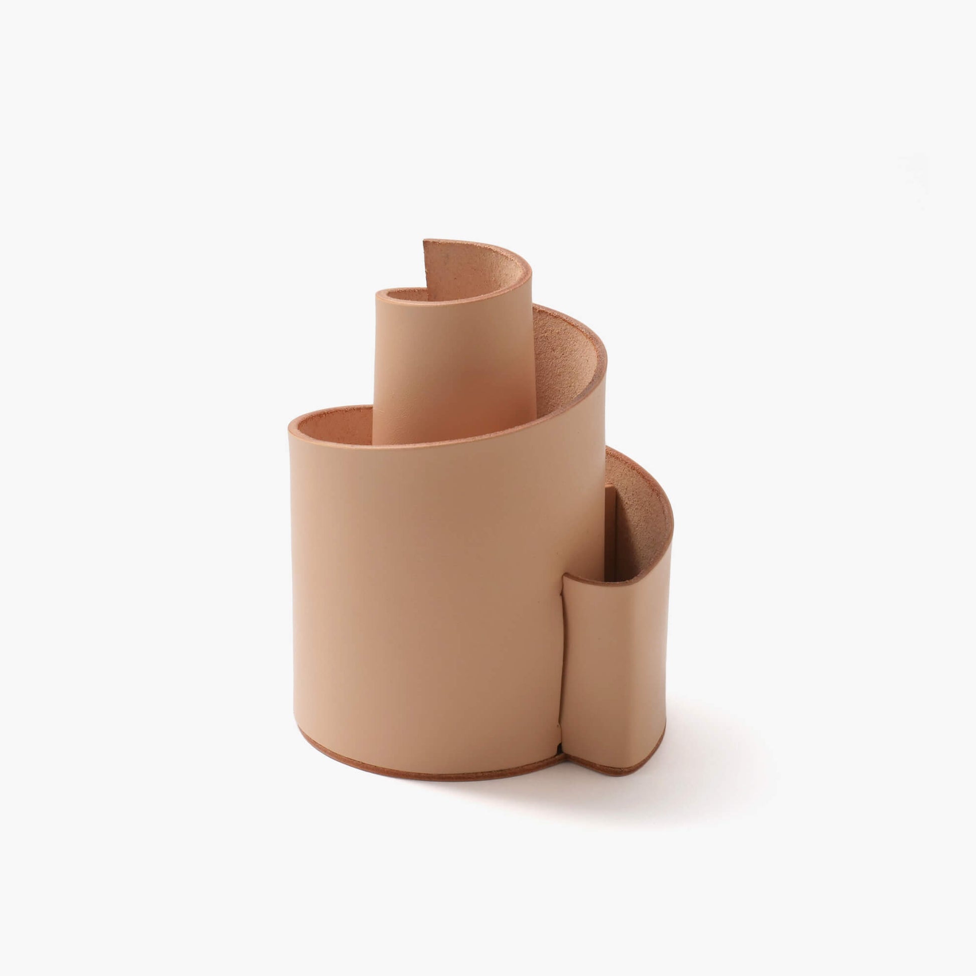 厚みのある1枚革を螺旋状に丸めて仕上げたペンスタンド。高さに合わせてそれぞれの部屋に仕分けることができるので、高さがバラバラの鉛筆や消しゴムも一緒に収納することができます。