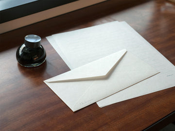 横に長めの洋形封筒。B5 サイズの紙が三つ折りでぴったり入ります。封筒にそのまま宛名を書けるよう、万年筆と相性が良く、日本製の紙のみを選んでつくりました。